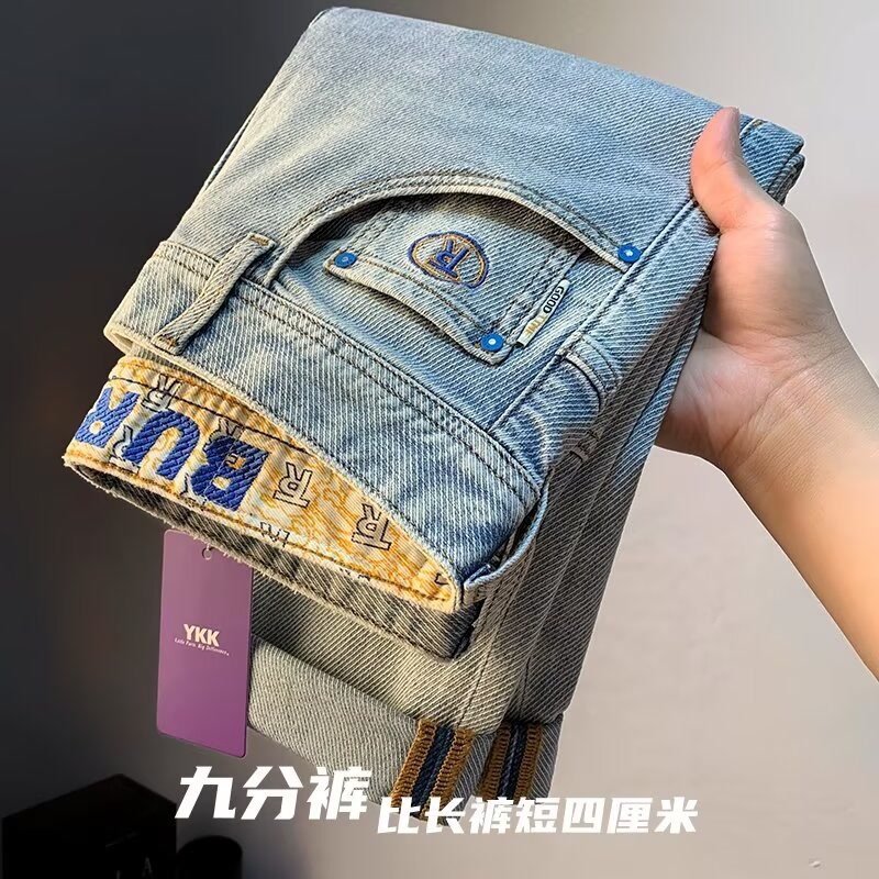 2024新型九分ジーンズ男性レトロ刺繍小ストレートズボン秋アメリカファッションブランドカジュアル長ズボン