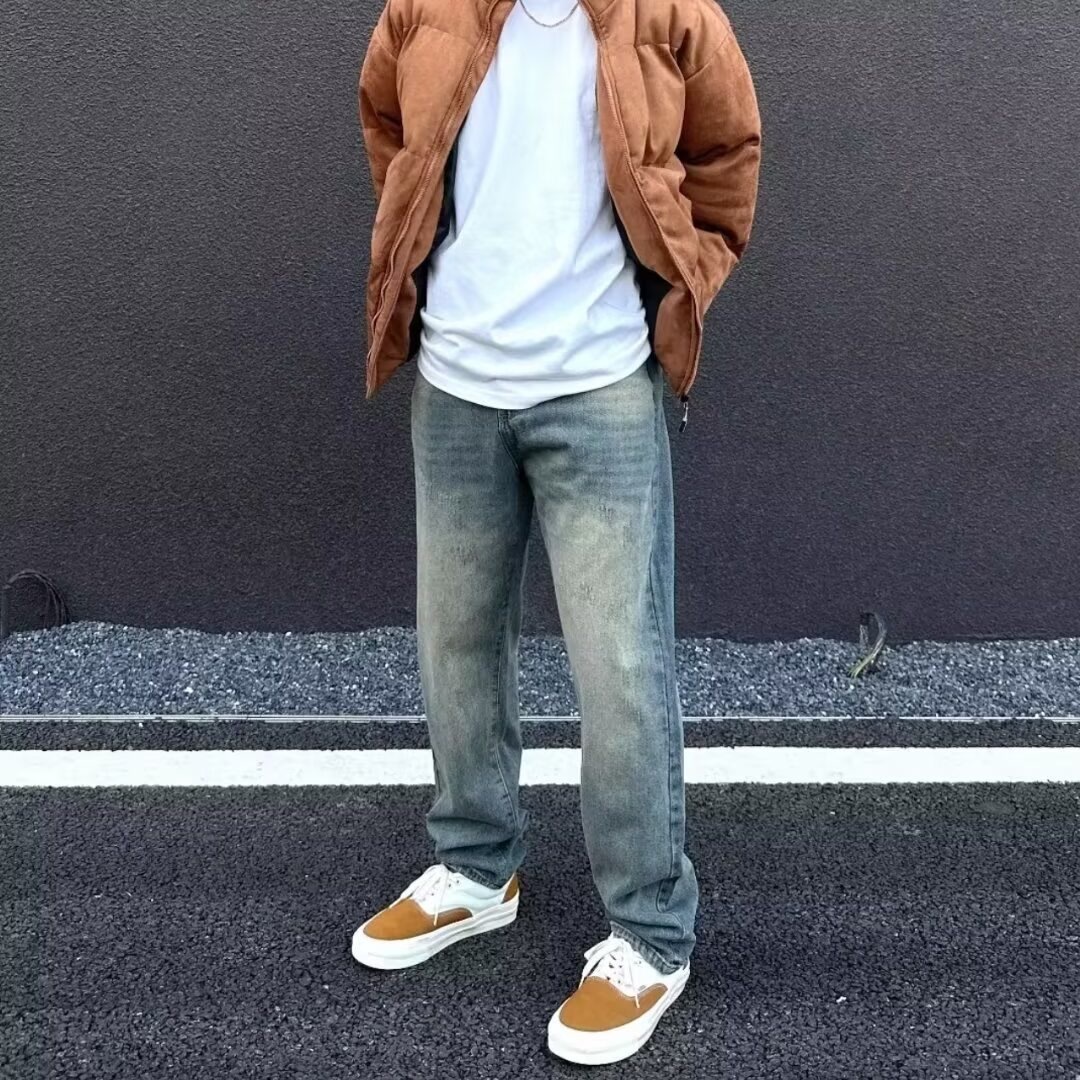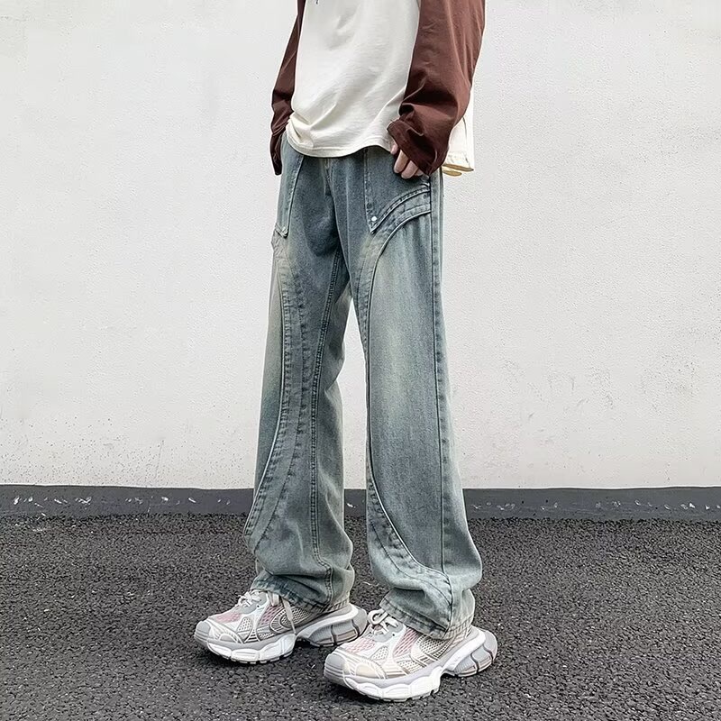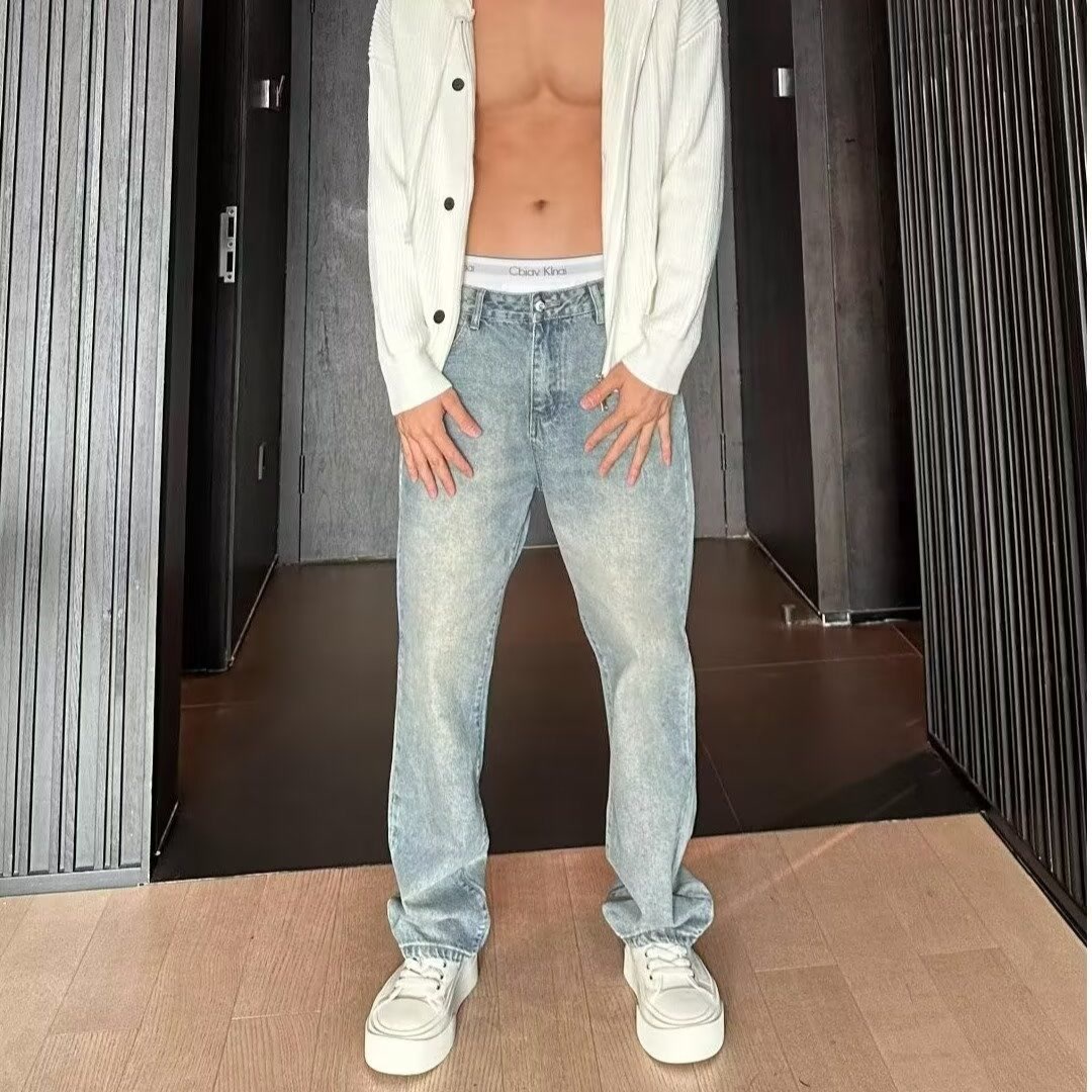 2024夏のアメリカ式水洗いは古いしわの模様のストレートジーンズの男性の軽い贅沢なレトロなズボンの薄いです。