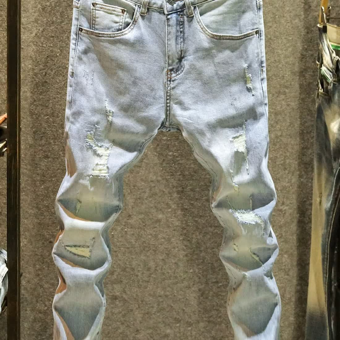 春夏の薄い色のぼろぼろなジーパンの男性の9分のゆったりした個性の韓国版の青年の弾力性の小さい足の乞食のズボンの潮牌