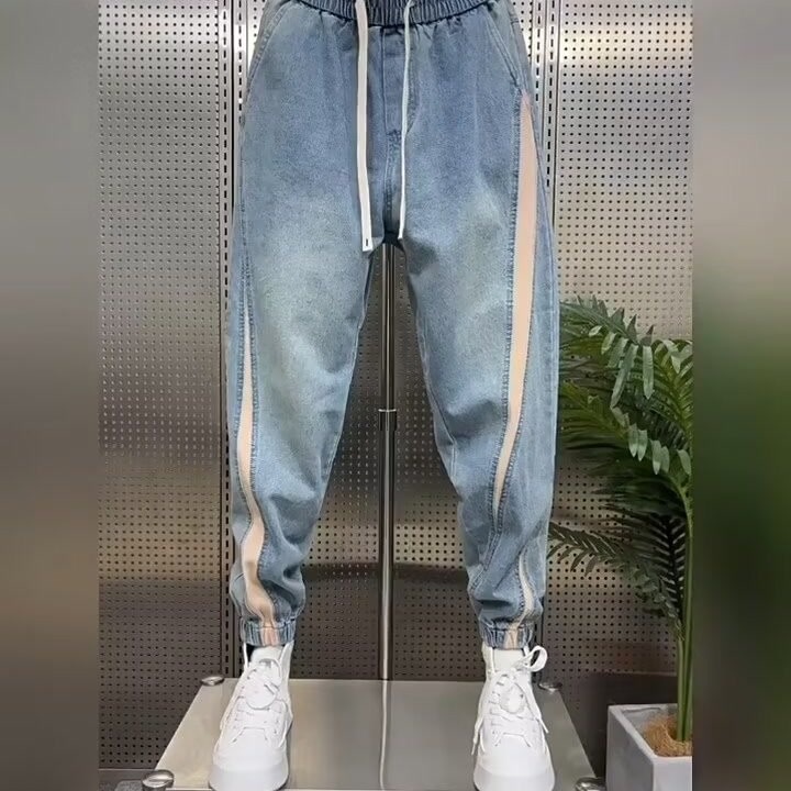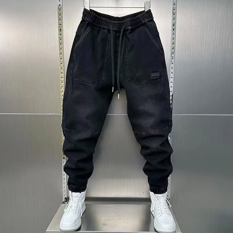 レトロな水洗いの青いジーパンの男性の2024夏のファッションのブランドのゆったりした束の足のハーレムのズボンのごろつきのかっこいい列はカジュアルなズボンを掛けます。
