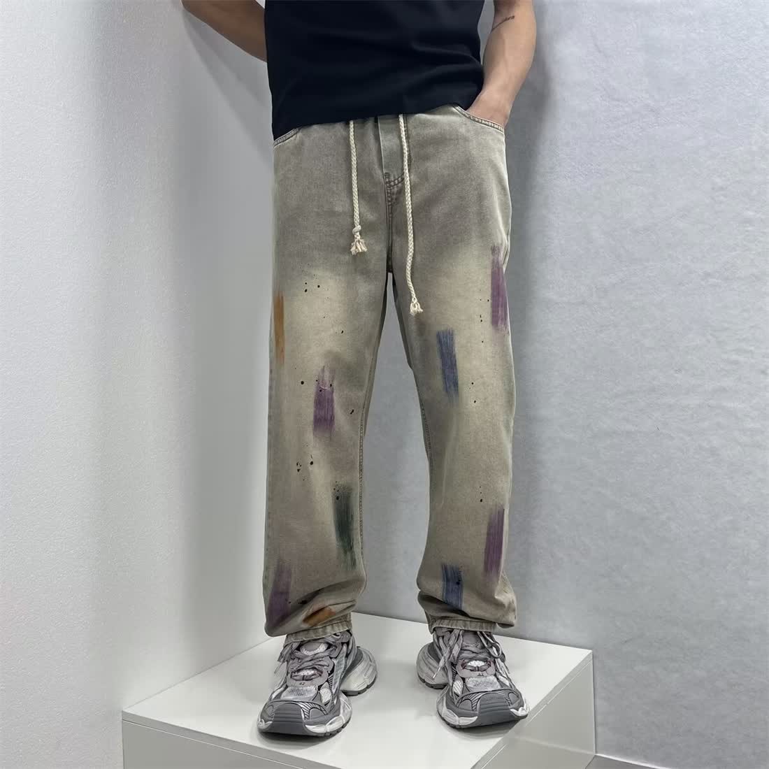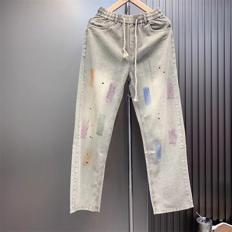落書き夏の男性レトロなストレートパンツの新しいゆるいファッションカジュアルパンツの薄いペンキ点ジーンズ