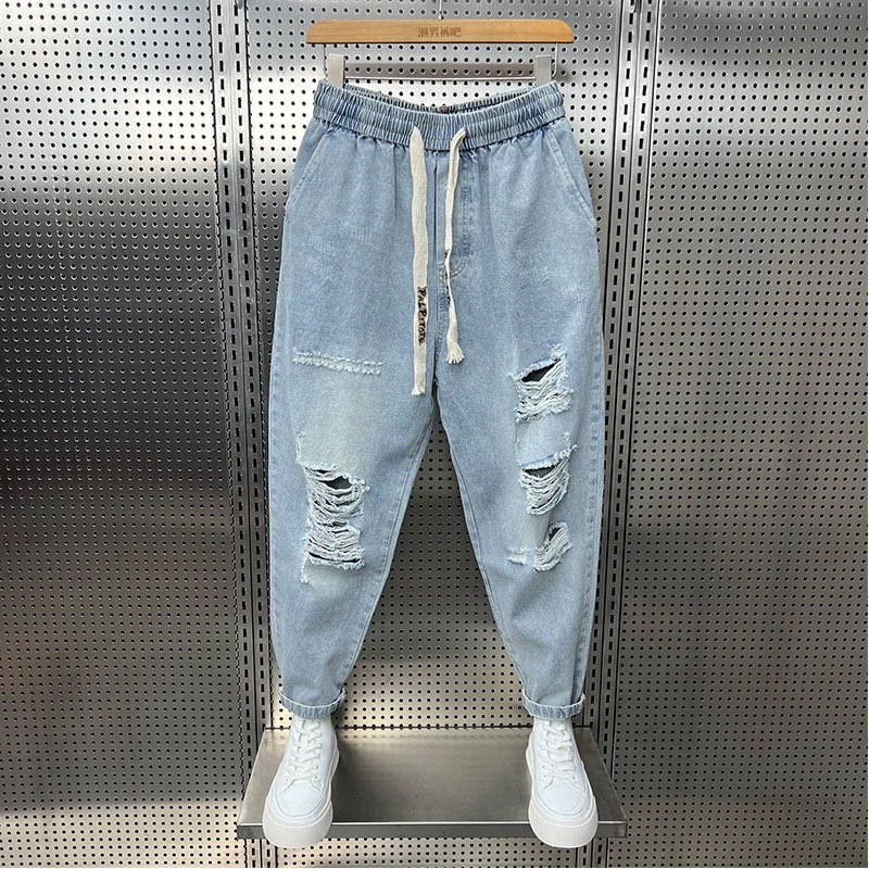 破れた穴の乞食のズボンの男性の2024夏のファッションの9分のジーパンのゆったりしている水洗いして腰の束の足のハーレムのズボンを締めます。