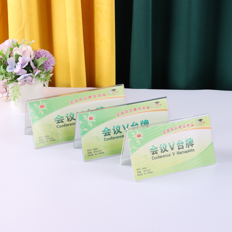 卸売りの三角会議の札v型の両面の台は透明なアクリルのテーブルに署名します。
