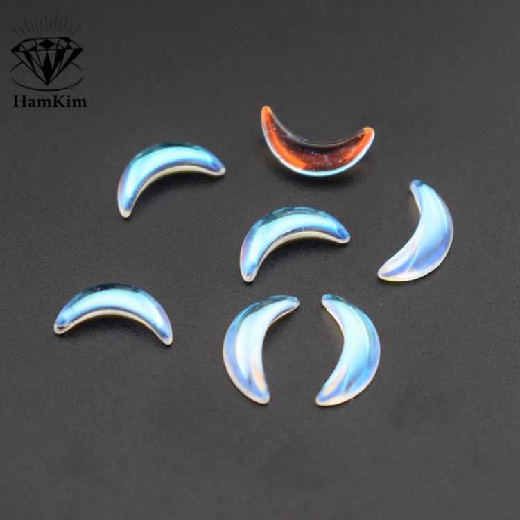 青い月の光の石の三日月の形の平の底の素面のab色の幻の月の光の石の戒面の裸の石の5*10mmの工芸の象眼石