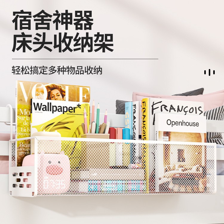 ベッドの上に物を置く棚のベッドの上にかごをかける寮の神器の良いものの上敷の学生の寝室のベッドの上にかけられた間食の収納棚があります。