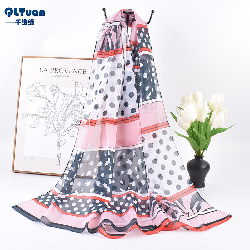 新しいファッションの丸い点のプリントの図案の薄い金の通気性のシフォンの女性のシルクタオルの日焼け止めの女性のガーゼの卸売り