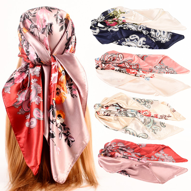 新作おしゃれで万能な花柄プリント高品質90*90サテン正方形スカーフ、卸売販売中