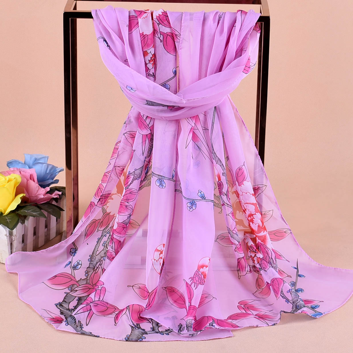 新商品の韓国版孔雀の牡丹の花の女性の長いタイプのシフォンのシルクタオルは春夏の種類のプリントのマフラーの小さいガーゼを卸売りします。
