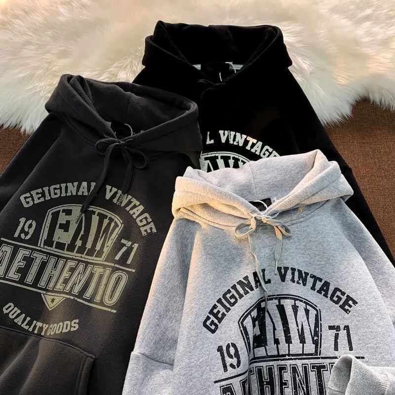 アメリカのカジュアルなアルファベットのプリントと帽子のカップルは秋冬のins韓国版のゆったりしたレトロなコートを着ています。