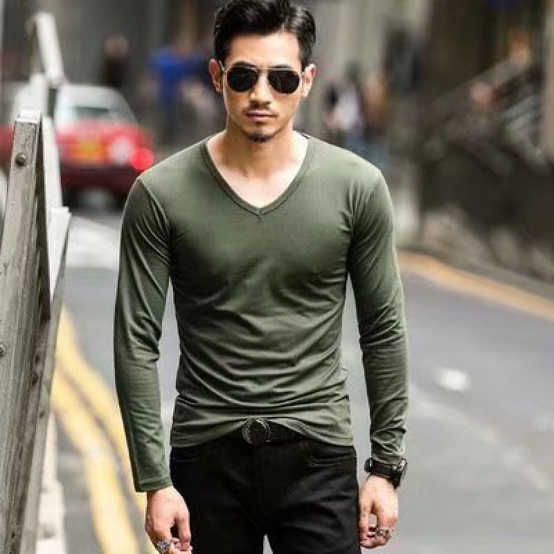 長袖tシャツの男性vネックの化粧品の秋の服の男性の薄い秋の上着の純色のtシャツの丸首の底のシャツの男性の秋