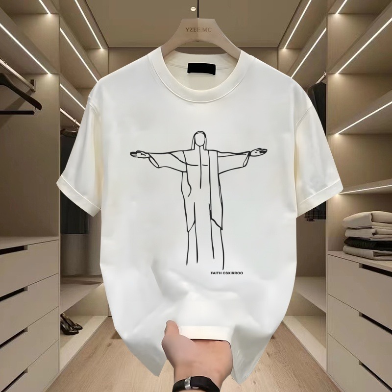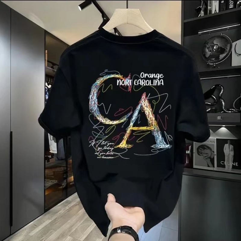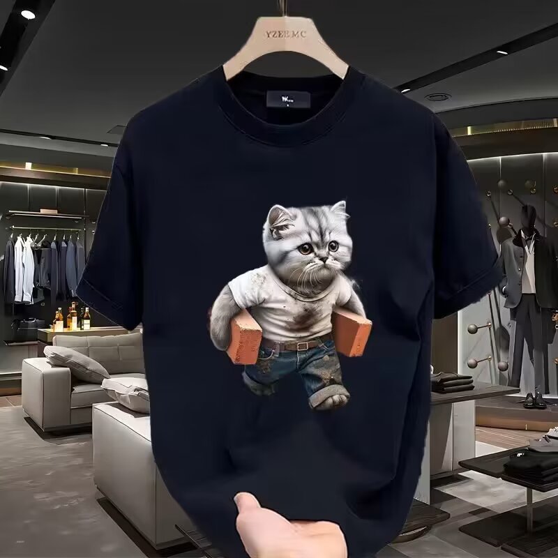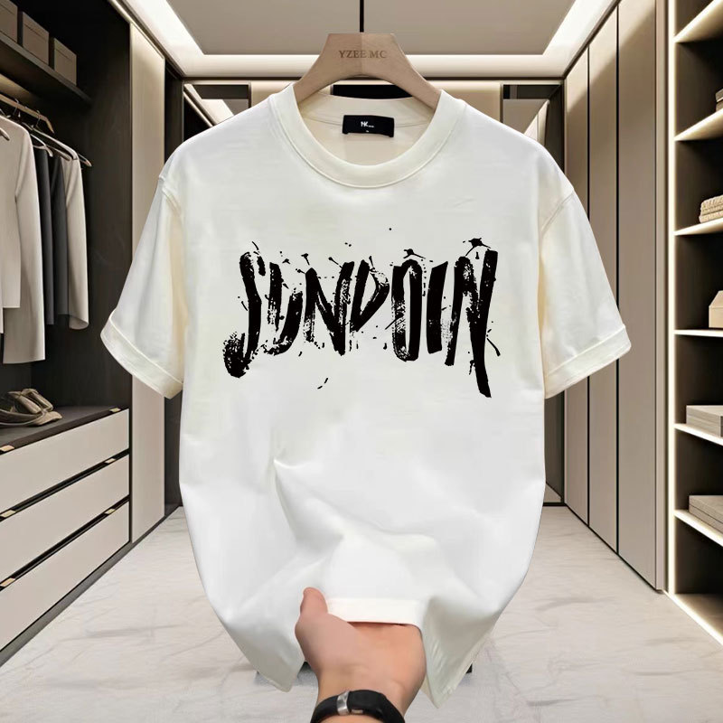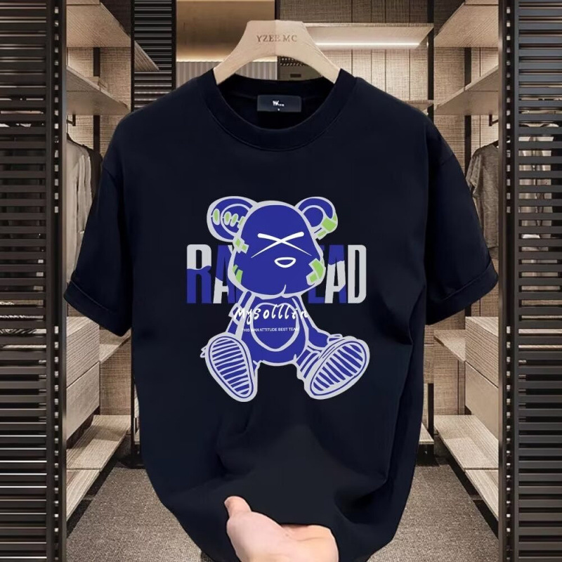 夏の新型純綿重ポンド半袖tシャツ男性プリント2025ゆるい半袖上着tシャツ丸首メンズファッション