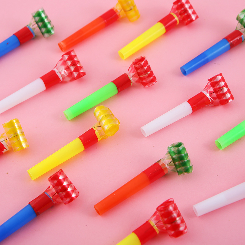 キャンディー色の吹龍口笛子供誕生日パーティープラスチック玩具卸売り多彩な吹龍巻きトランペット道具