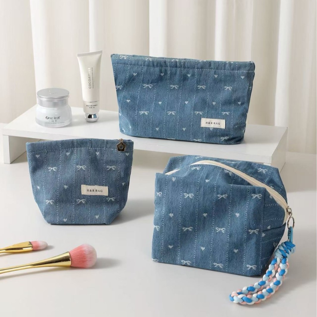 新しいインシンプルなデニムラブリボン生地化粧品バッグ旅行スキンケア製品洗浄収納袋枕