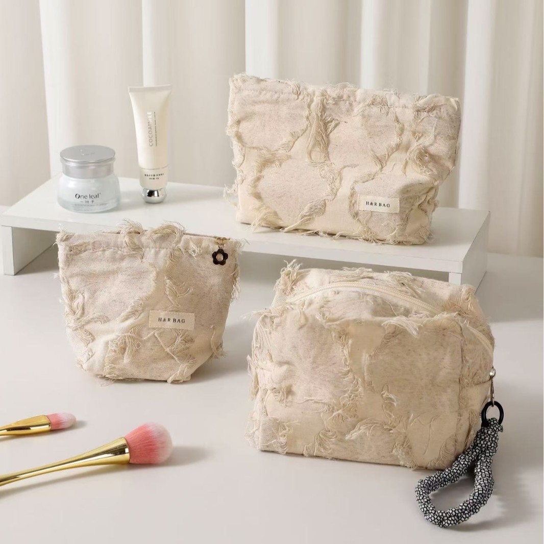 新しいレトロなスタイルのコットンとリネンのタッセル化粧品バッグ、旅行用スキンケア製品収納バッグ、ポータブルハンドピローバッグ