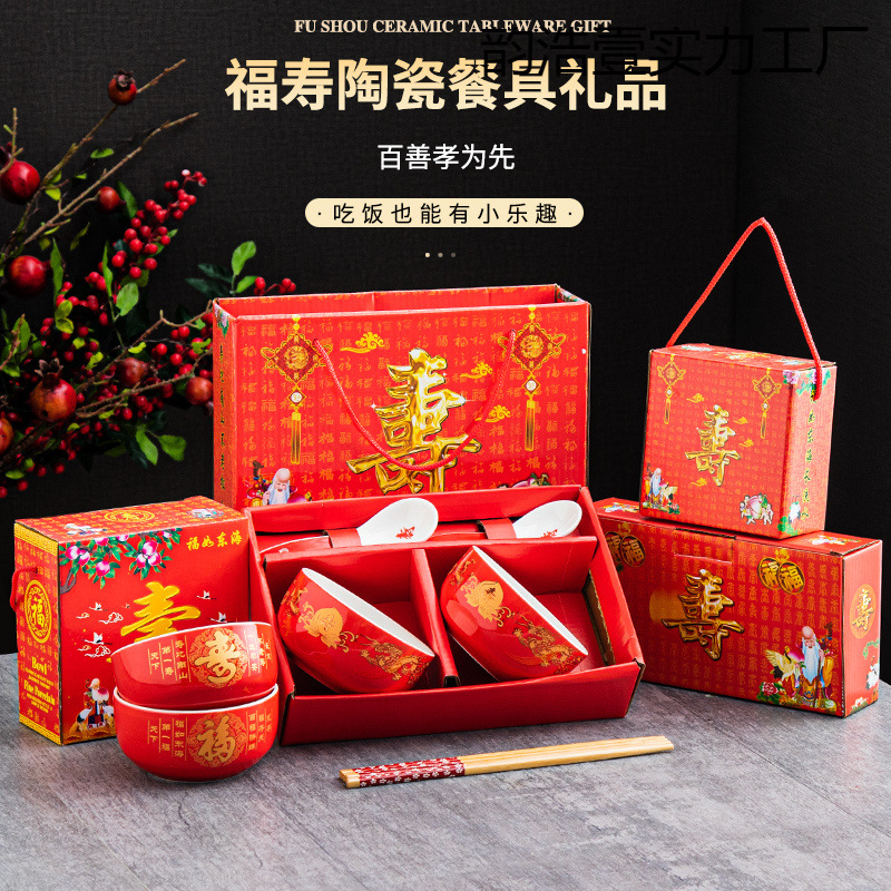 中国式陶磁器の赤い碗の竜鳳の誕生日の碗の贈り物の箱入りの誕生日の宴会の老人の誕生日の彫刻の印刷のお返しの誕生日のタオル