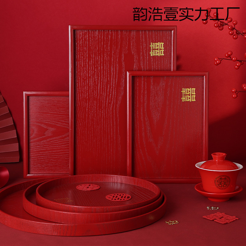 赤い長方形の木製トレー結婚祝い茶皿家庭用ティーカップ結婚果物皿間食円形敬茶皿