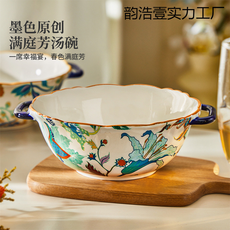 陶磁器の両耳のスープの碗の家庭用の2024新型の大きいサイズのスープの鉢の高い顔の価値の大きい碗のスープの碗のナットの粉の泡の碗