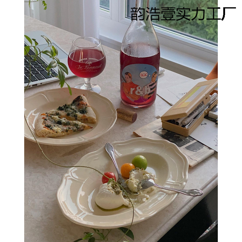 フレンチインスタ风クリーム色セラミック洋食皿レース楕円レトロデザート皿クリームケーキ皿鱼皿