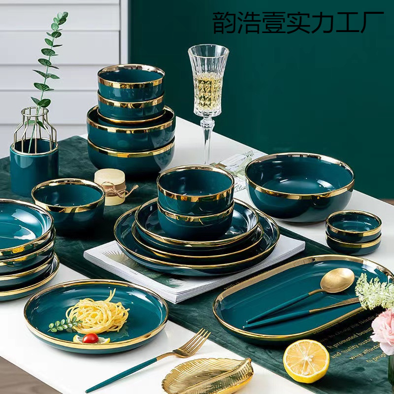 ヨーロッパ式の金辺の陶磁器の碗の家庭用の皿の野菜の皿の単一のアイデアは金メッキして軽くて豪華なご飯の碗の皿の食器の食器の箸の禄邦です。