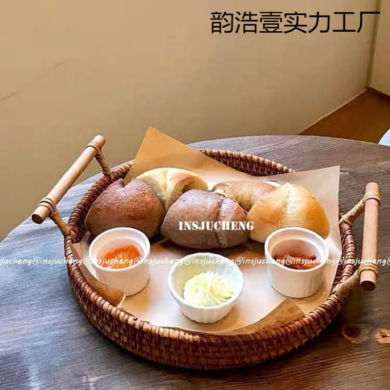 INSレトロ藤編みパンお菓子両耳トレー円形編みフルーツバスケット置物茶皿ペストリー皿