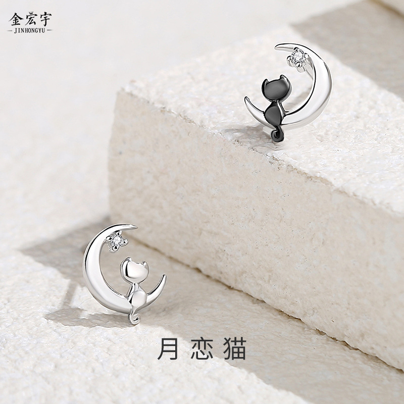 オリジナル月恋猫ピアス925純銀かわいい少女心百合イヤリング小衆デザイン耳飾り卸売り