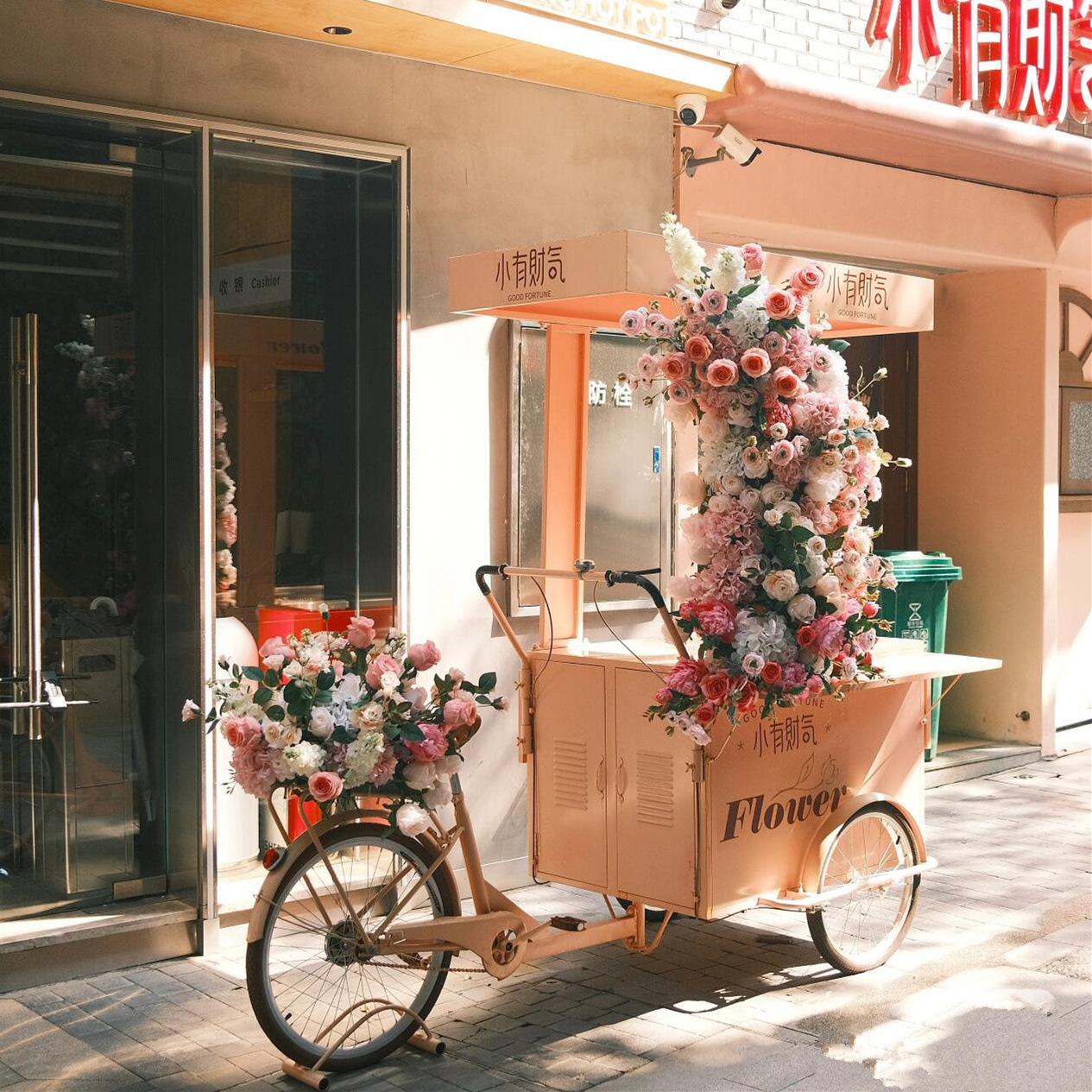 移動コーヒー車の多機能販売車の装飾品は自転車に乗って屋台車の屋外ミルクティー三輪車の花を並べます。