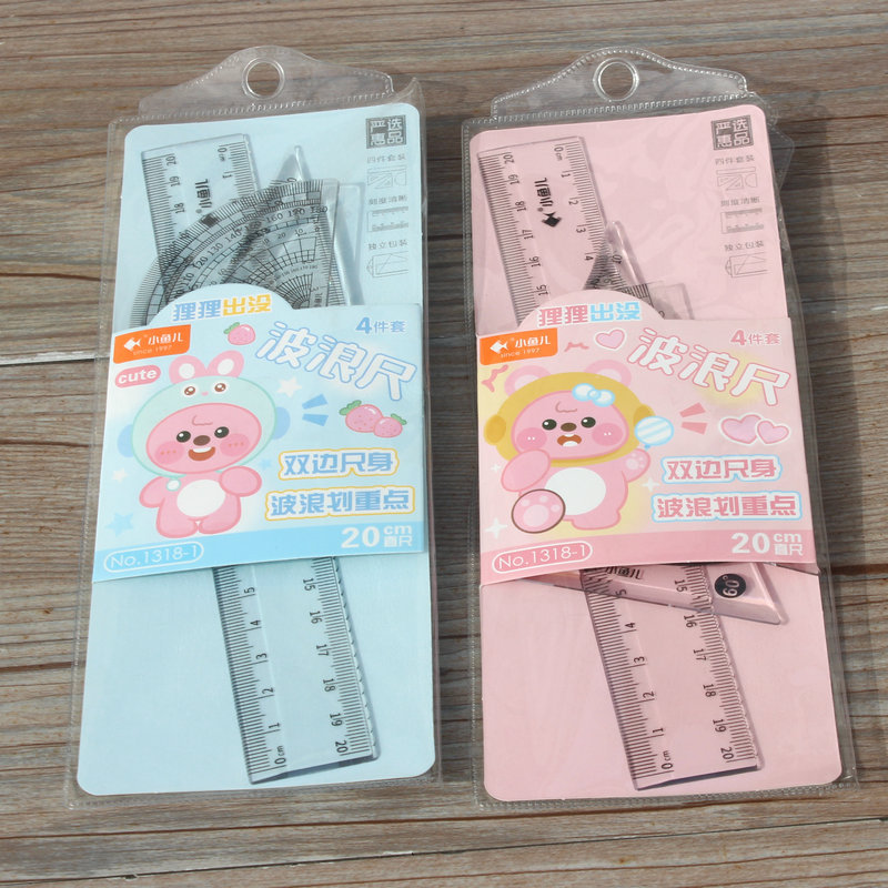 小魚の20cmの競争品のセットの定規の目盛りがはっきりしていて、学生の厚いpvc袋の4つのセットの文房具を測定します。