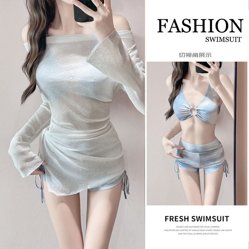 2025新型ぼんやりしていて、白いワンピースの2つのセットの水着の女性の長袖のブラウスの日焼け止めの学生の保守的な温泉の夏です。