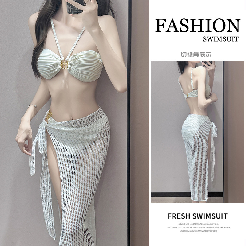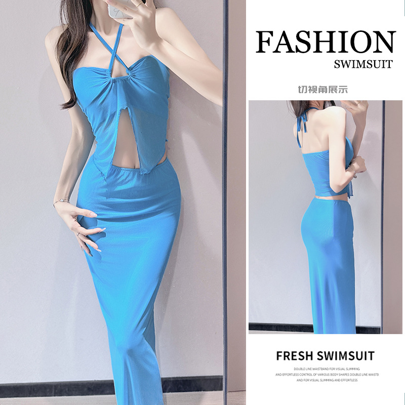 2025 新しい水着ホットガールスプリットブルー美白海辺休暇ロングスカートチューブトップホルターネックセクシーな温泉