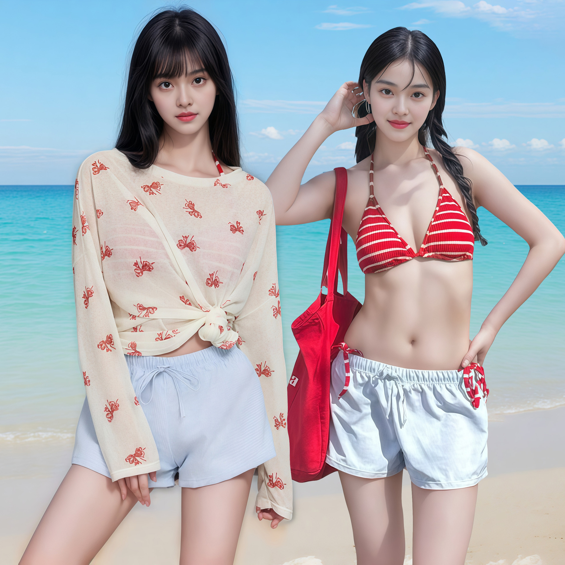 2025 新しい水着女性のビキニスプリットレッドストライプ美白セクシーな長袖ブラウス抗日焼け休暇温泉