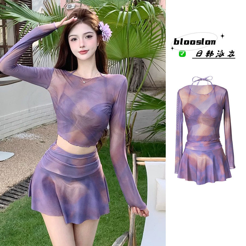 2025新型水着女性セクシー紫網糸ビキニ透視包ヒップスカートセット温泉痩せ休暇