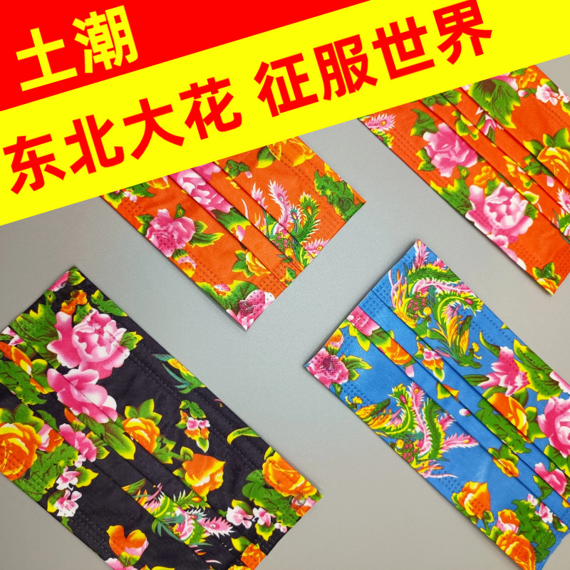 東北大花マスク使い捨て三層防護独立包装プリント新年ネット赤同金土潮国潮