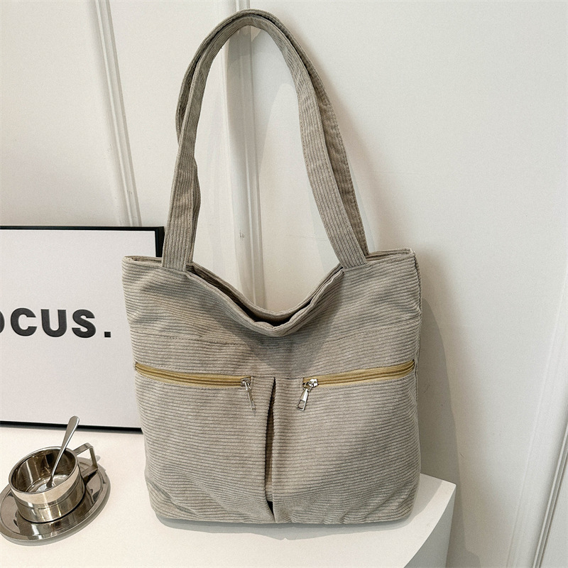 純色大容量コーデュロイハンドバッグ2024新型シンプル条絨毛シングル肩脇下バッグ通勤トートバッグ