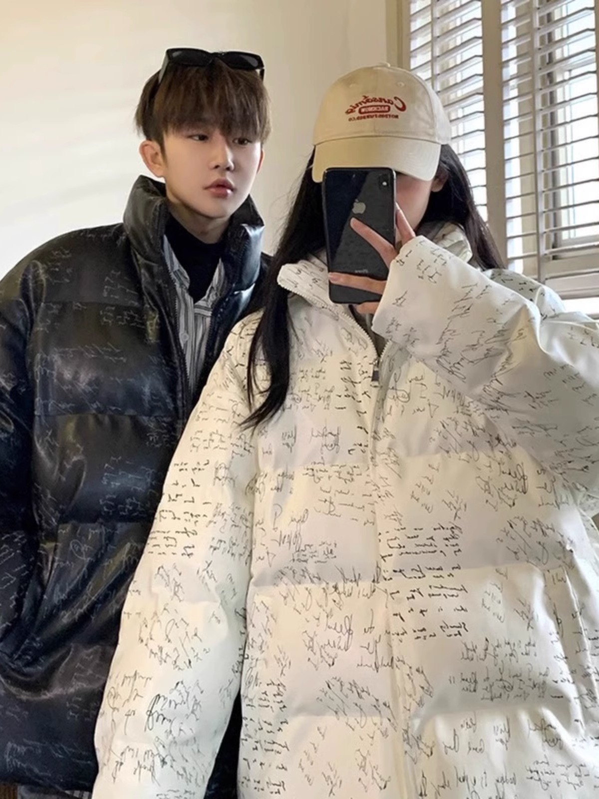 二人はコートを着ています。男性は冬の香港風のブランドです。
