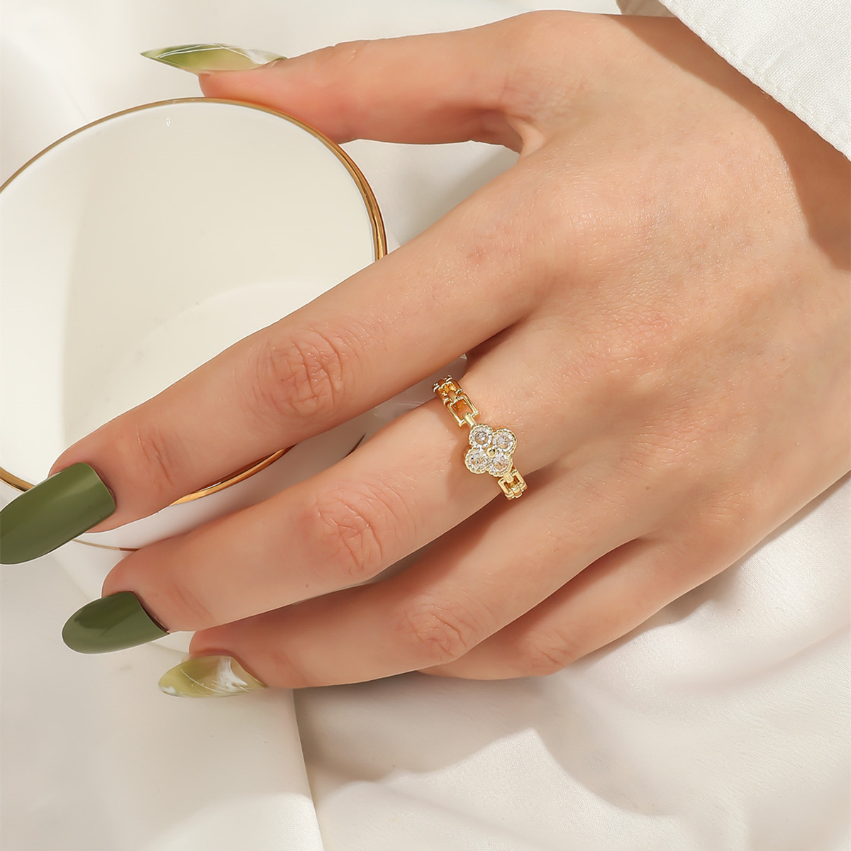日韓insファッション軽豪華ジルコン四葉草指輪幸運草開口指環女2022年新作卸売り