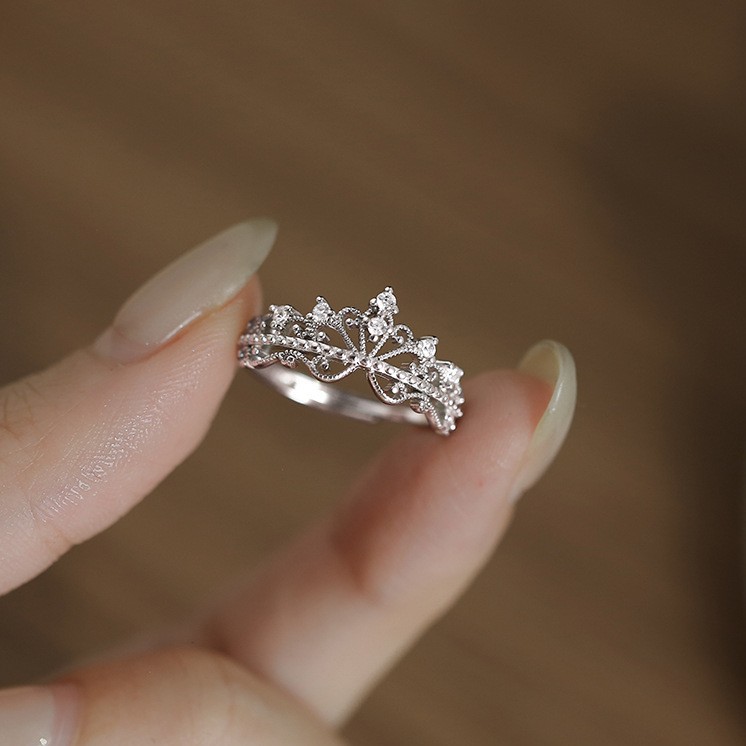 女性用フラッシュダイヤモンドクラウンリング、中空レースパターンの人差し指リング、ハイエンドリング、2025新しいスタイル