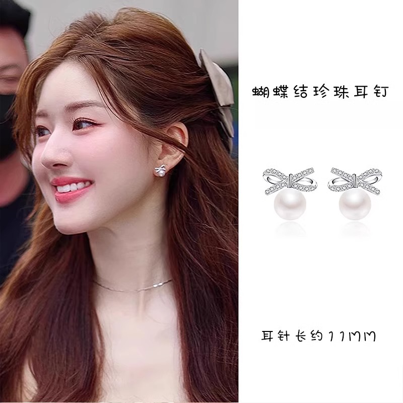 2025 新しいZhao Lusiと同じスタイルのイヤリング、蝶結びの真珠のイヤリング、女性のニッチなデザイン、軽い高級感のイヤリング