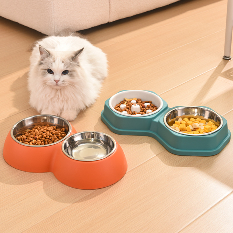 工場直販ステンレス製犬猫ボウル、ペットボウル、斜め口給餌、キャンディーカラーのダブルボウル、飲料水、首の保護、漏れ防止