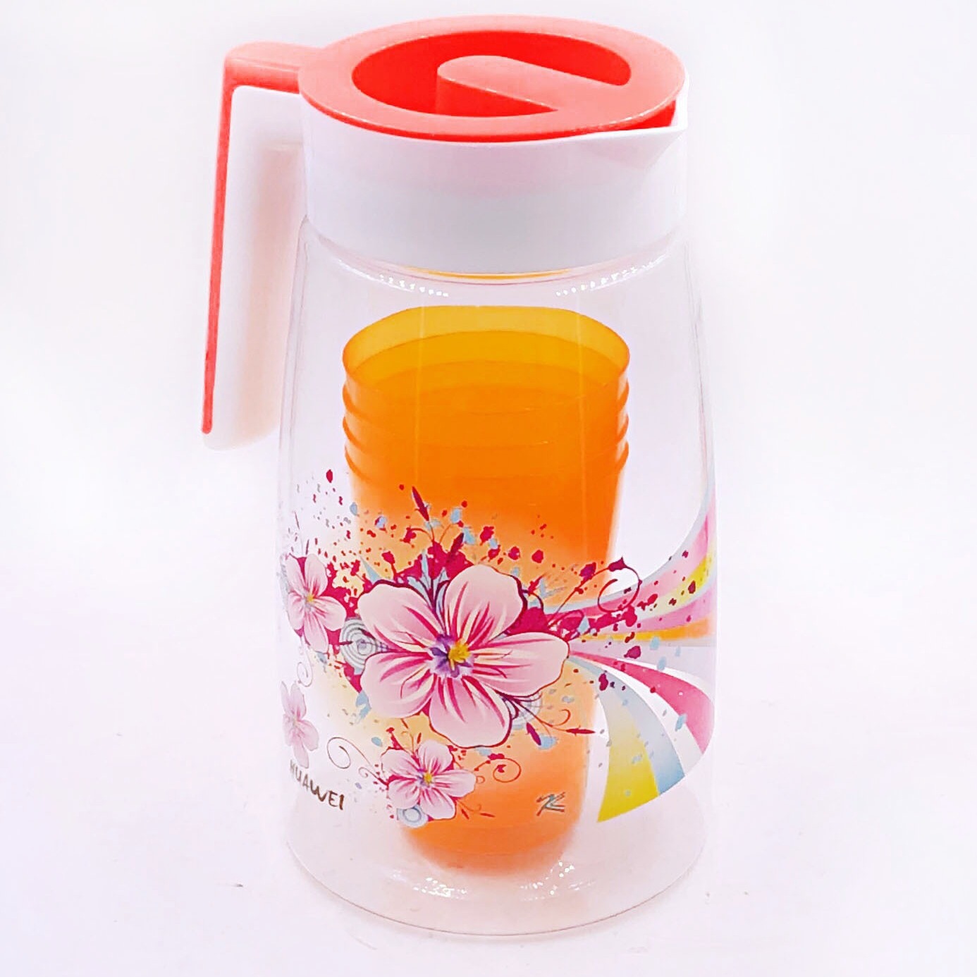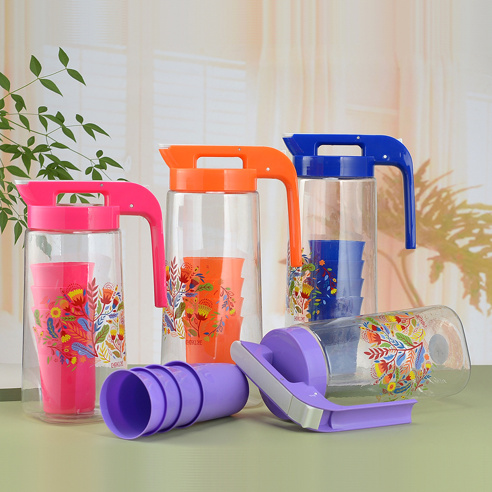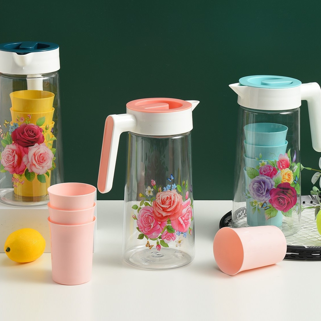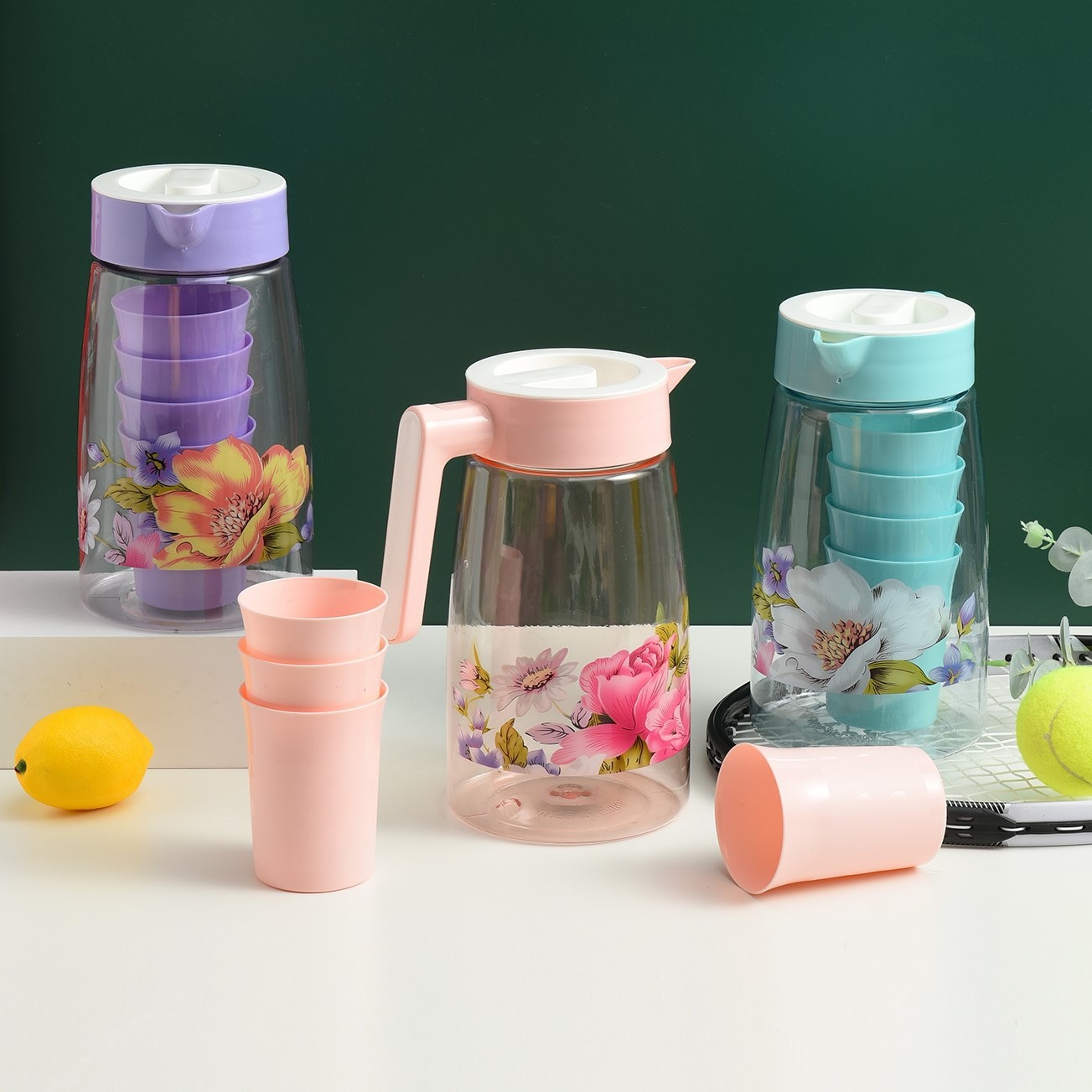 家庭用プラスチック透明冷水ポットセットPET箔押しカップ飲料花茶ジュースポットトレイ付き