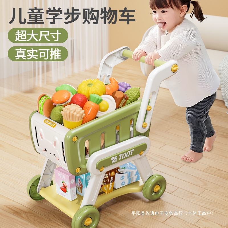 子供の買い物の手はおもちゃを押して歩いて歩くことを学びます。