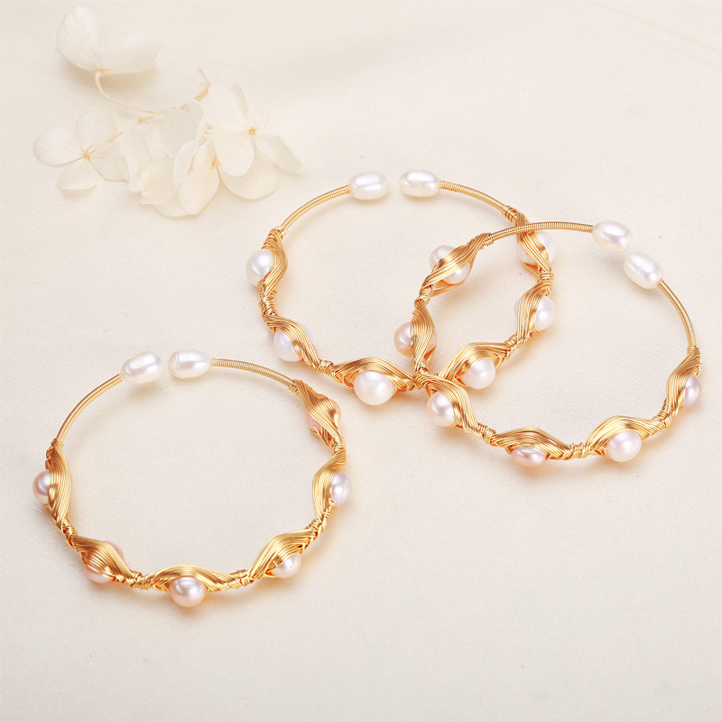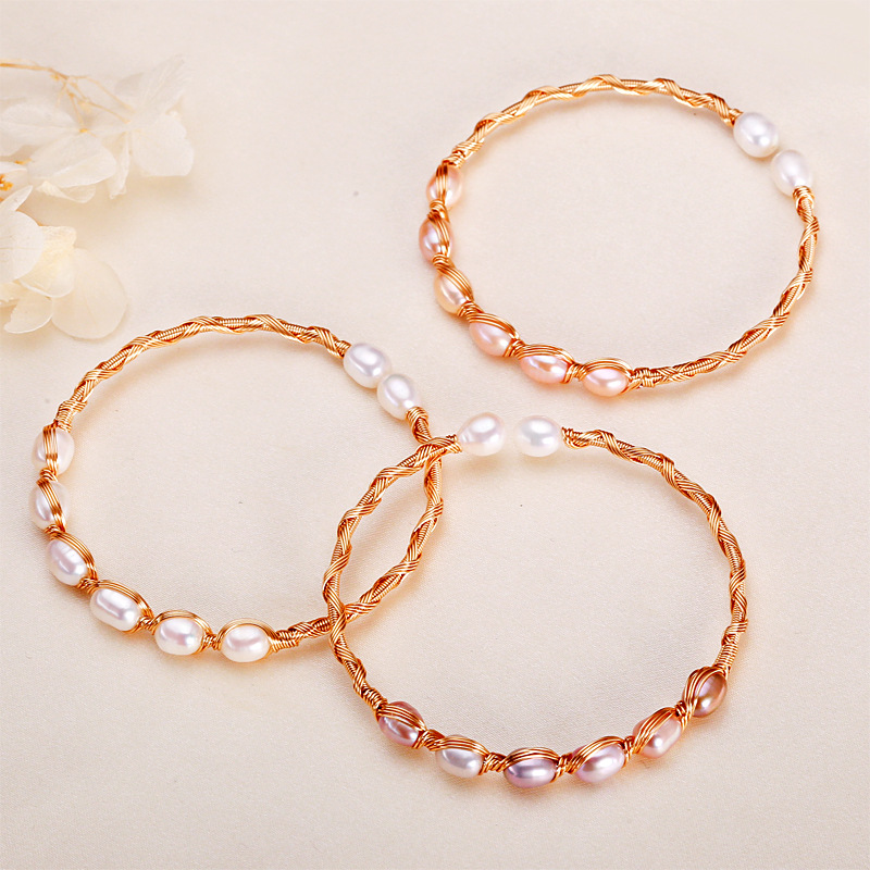 ファッショナブルでシンプルな朱吉淡水パールブレスレット、フェミニンなライスビーズ銅金メッキワイヤーブレスレット、ブレスレット卸売