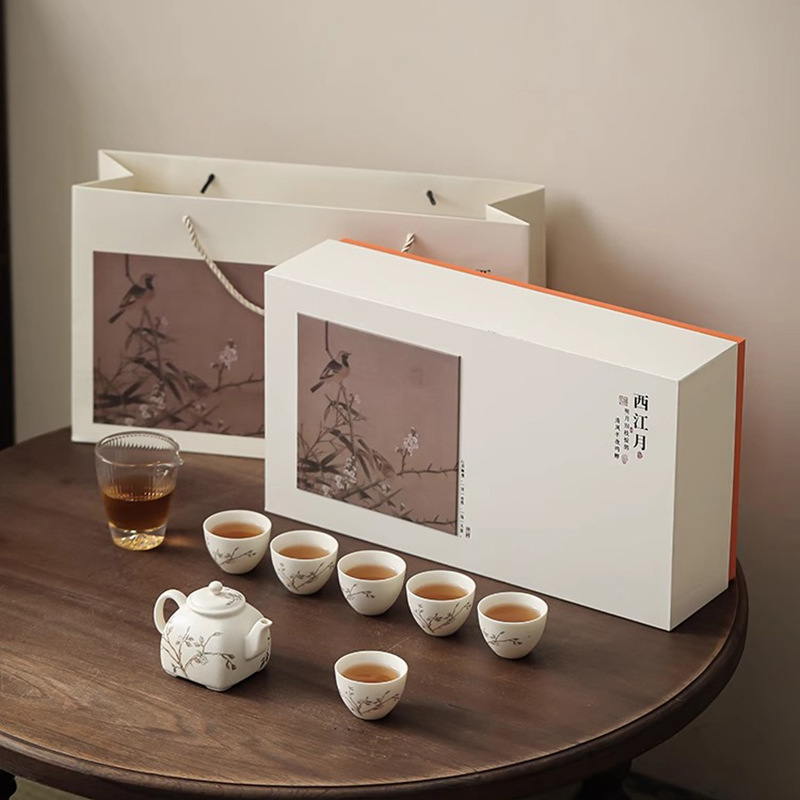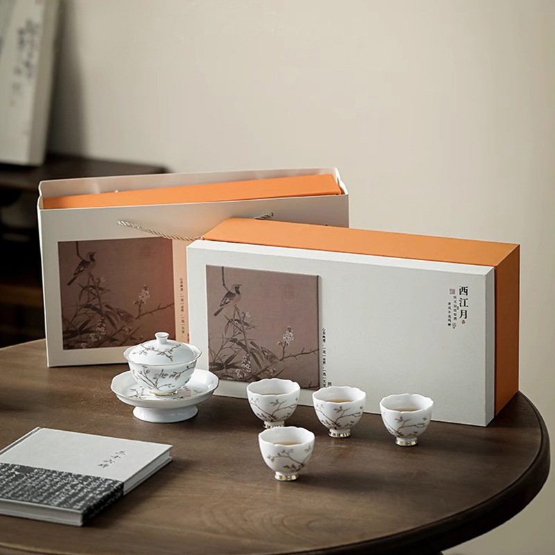 レトロの軽豪華な羊の脂の玉の磁器の茶器のセットのセットの工夫の茶器の文人は茶器の家庭用の贈り物の箱に入って贈り物をします。
