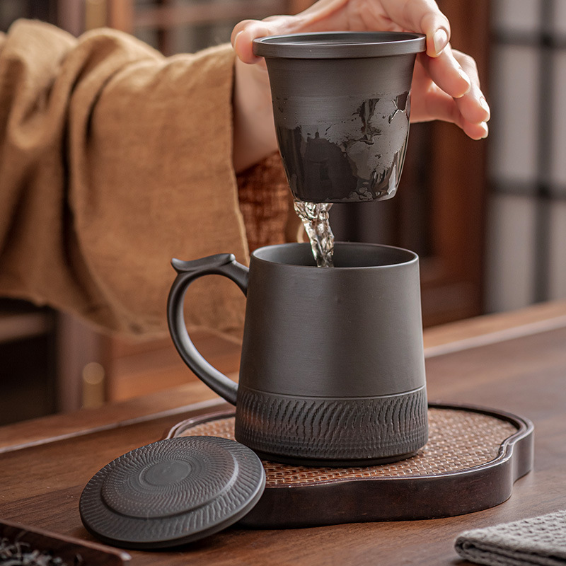レトロな紫陶器ジャンプナイフオフィスカップ家庭用セラミックマグ蓋フィルター付きリビングルーム中国風ウォーターカップカスタムロゴ