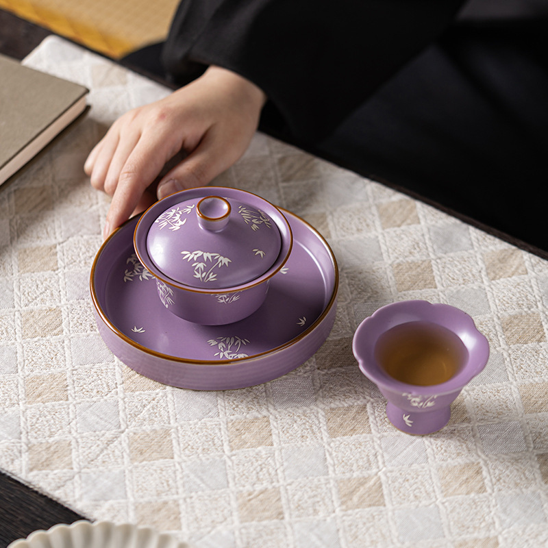 紫汝銀竹影蓋碗陶磁器泡茶器茶杯家庭用中国風茶室茶芸展示オーダーロゴ