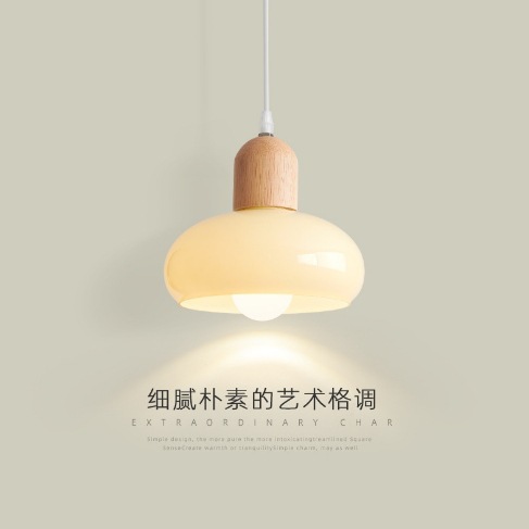 ベッドの上のシャンデリアは現代的にシンプルな原木クリーム風食卓です。
