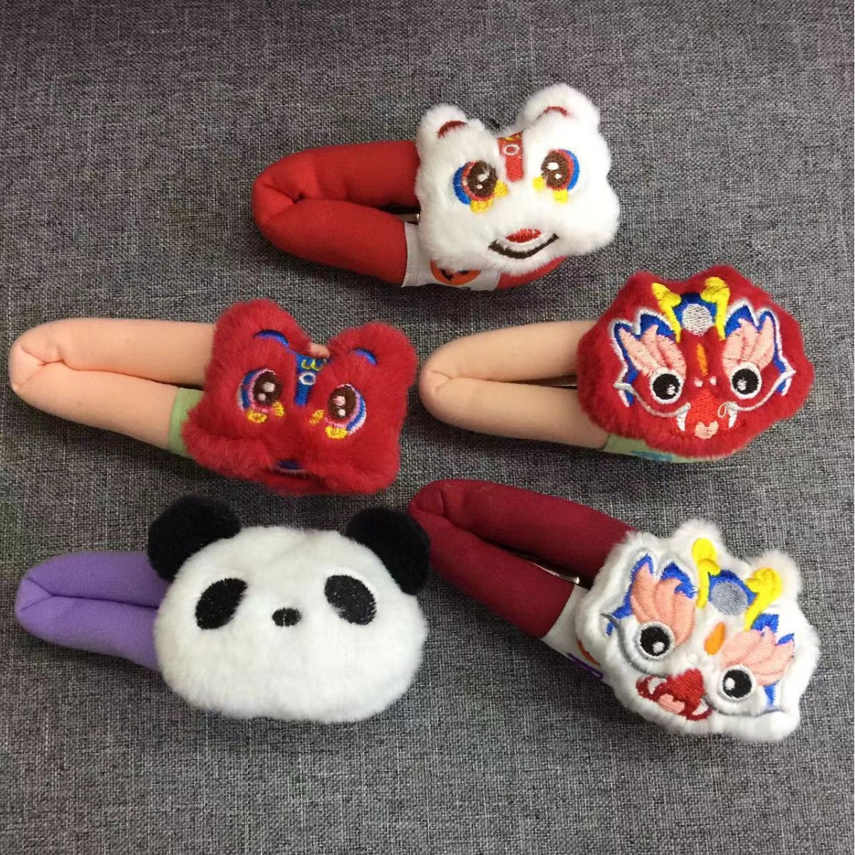 新年のプレゼント目が覚めたライオンの髪飾りがかわいいぬいぐるみの子供の髪が龍年のお祝いの前髪を挟んで新年の髪飾りをします。