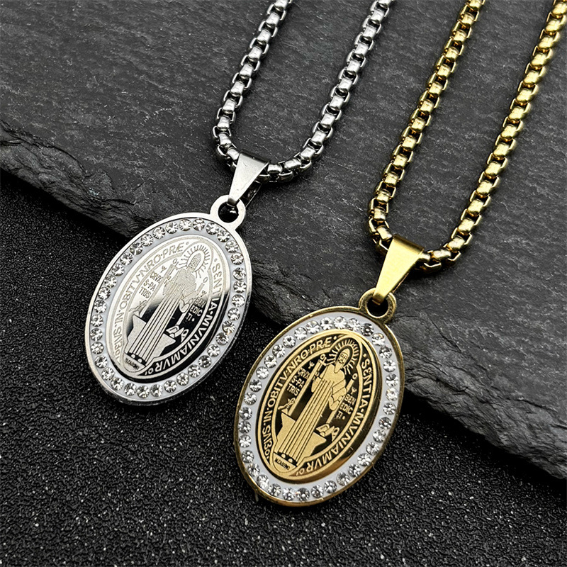 国境を越えた新作聖ベネディクトネックレス、ステンレス製アクセサリー、ダイヤモンド風ジュエリー、ユニセックスヒップホップペンダント