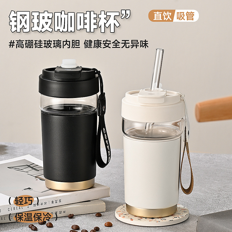 国境を越えた新しいダブルコーヒーカップ高颜値自動車カップ内高ホウ素シリコンガラス外ステンレスストロー保温カップ