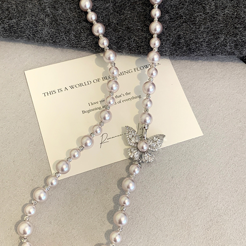 マンタのバラの蝶の真珠のネックレスの女性の秋冬の長いタイプのビーズのセーターのチェーンの高級感の百合の軽い豪華なアクセサリー