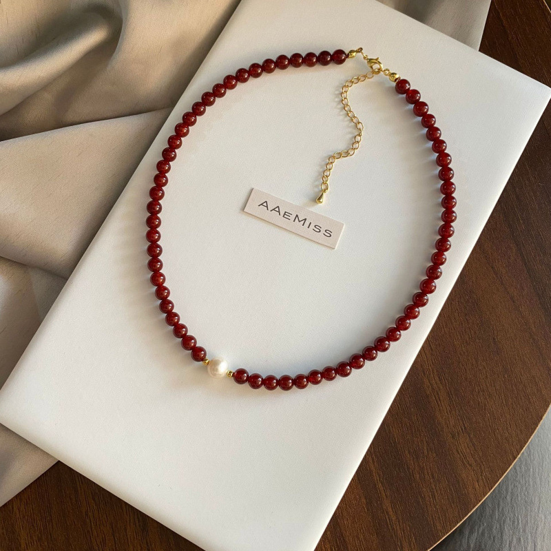 新中国式の赤い瑪瑙の数珠の天然の淡水の真珠のネックレスの女性の軽くて豪華な高級感の鎖の鎖の気質のセーターの鎖